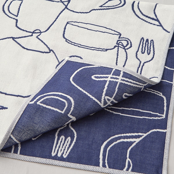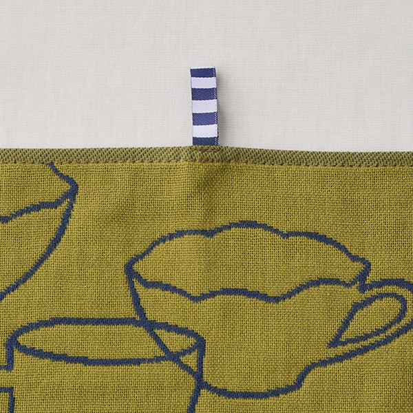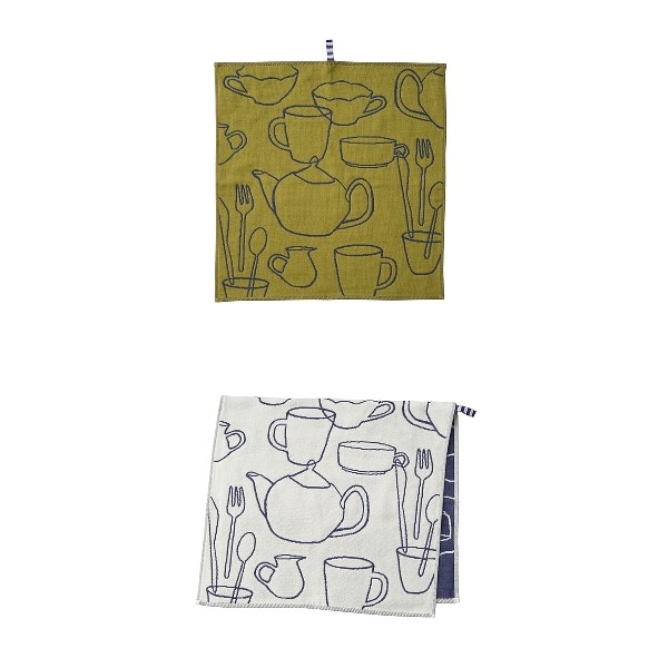 ポットやカップなど、ティータイムを楽しむときに使う食器をあしらった、ティーブレイクふきん。