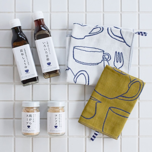 ふだん使いにうれしい調味料とふきんのセットは、気軽な贈りものにぴったり。