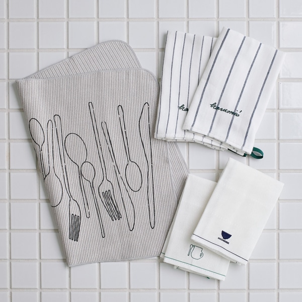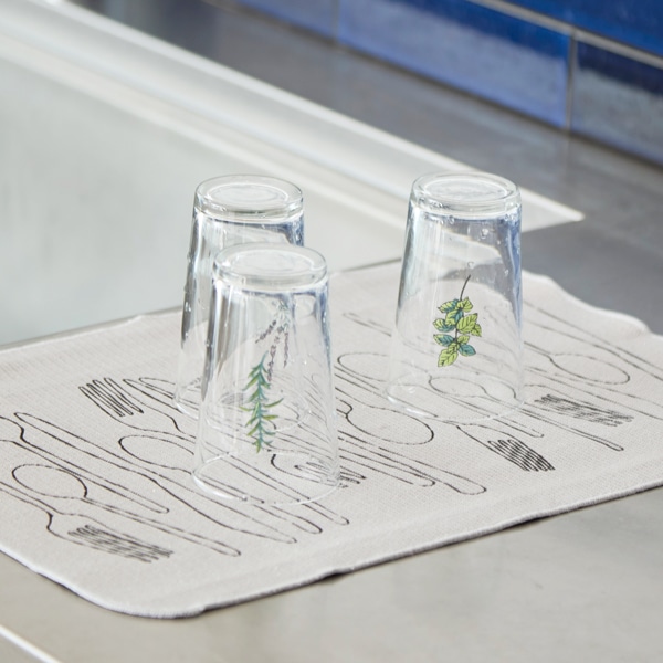 カトラリーのイラストをあしらった、抗菌・防臭水切りマット&ふきん。