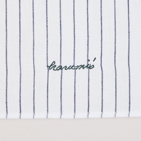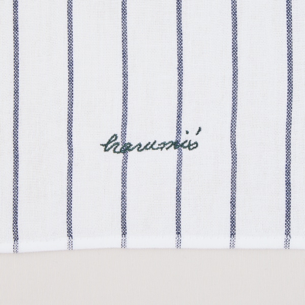 白地にネイビーのストライプ柄で、「harumi's」の刺繍をあしらいました。