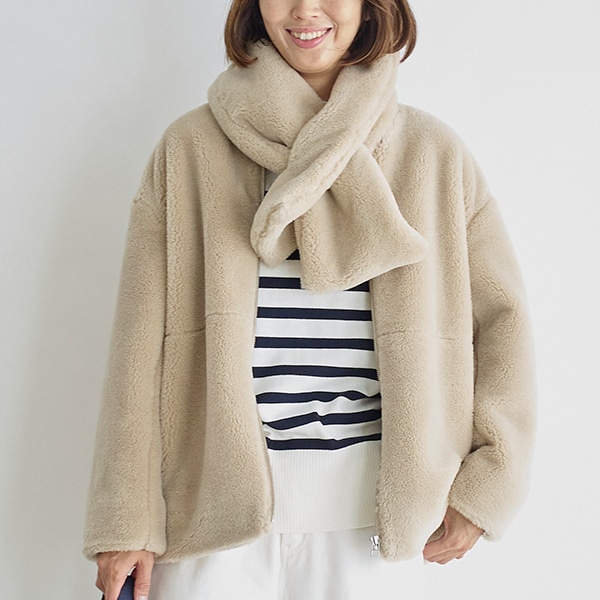 カジュアル過ぎないノーカラーで、大人が着やすいボアアウターです。