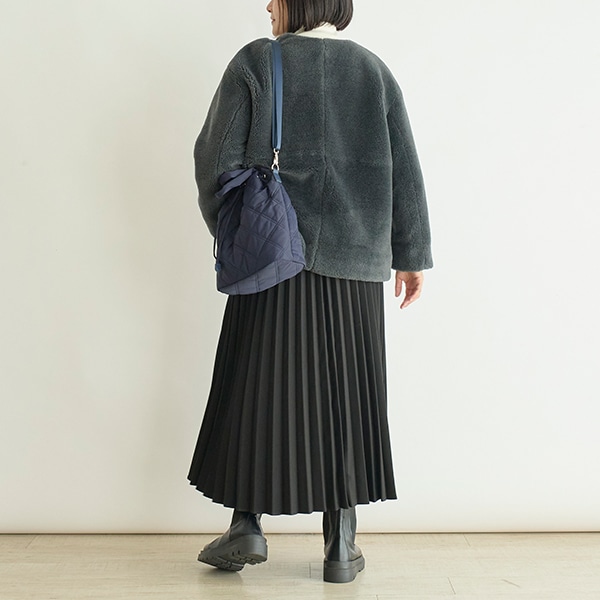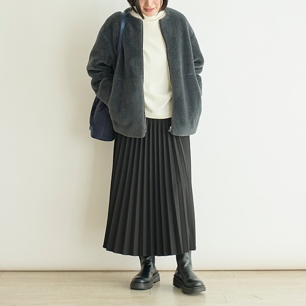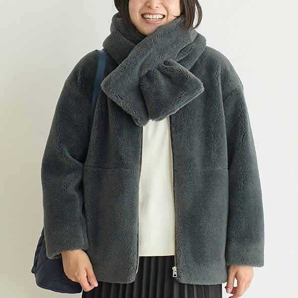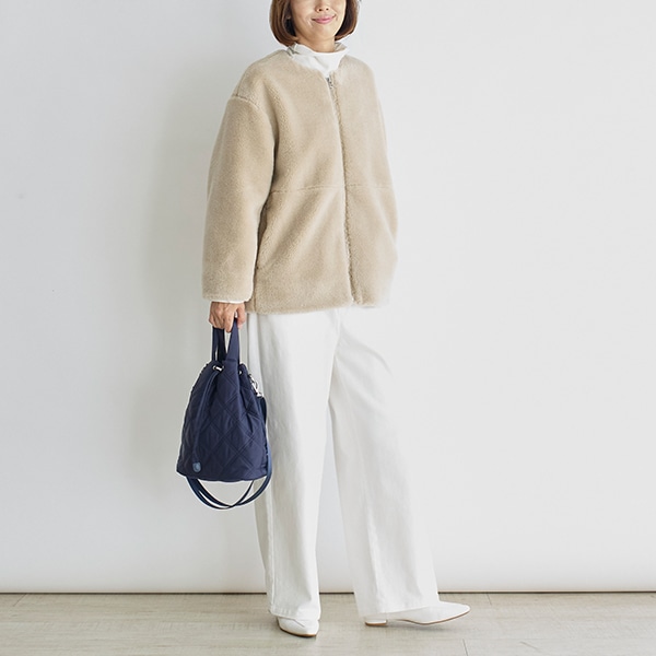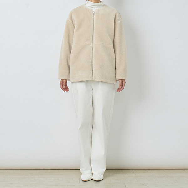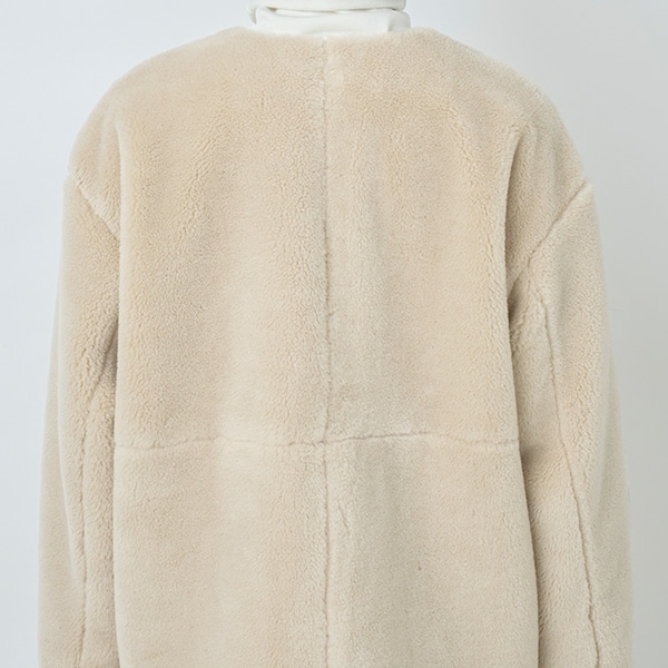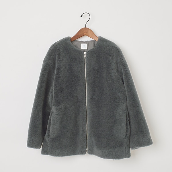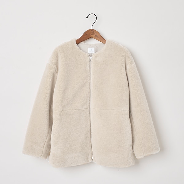 カジュアル過ぎないノーカラーで、大人が着やすいボアアウターです。