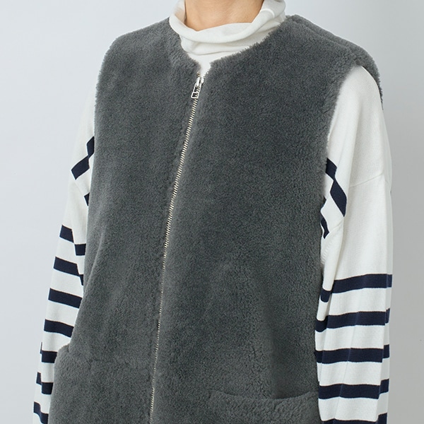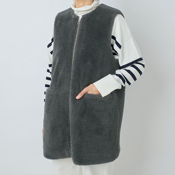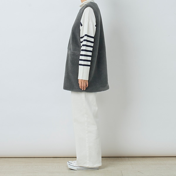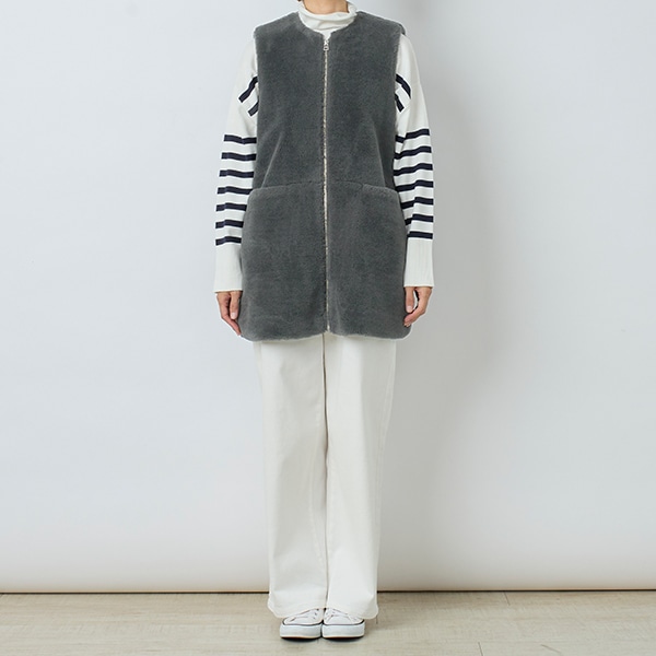 首元はすっきりとしたノーカラーデザインで、襟のあるトップスやマフラーなどの組み合わせも◎