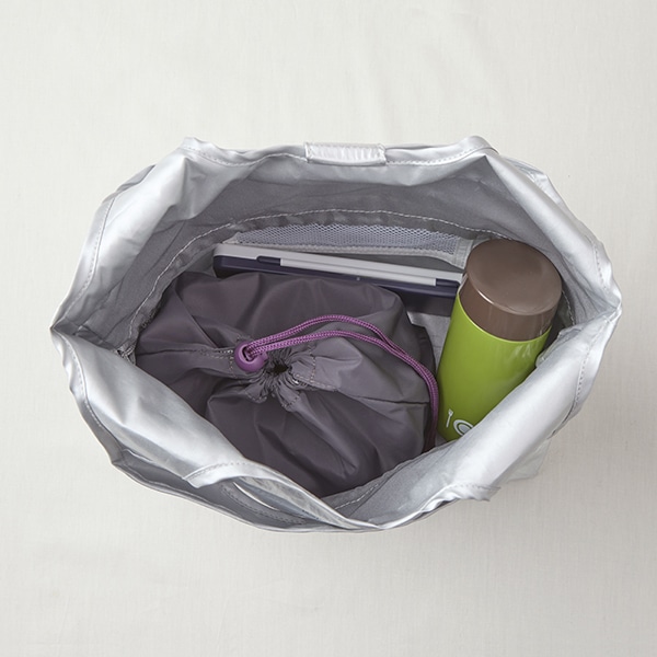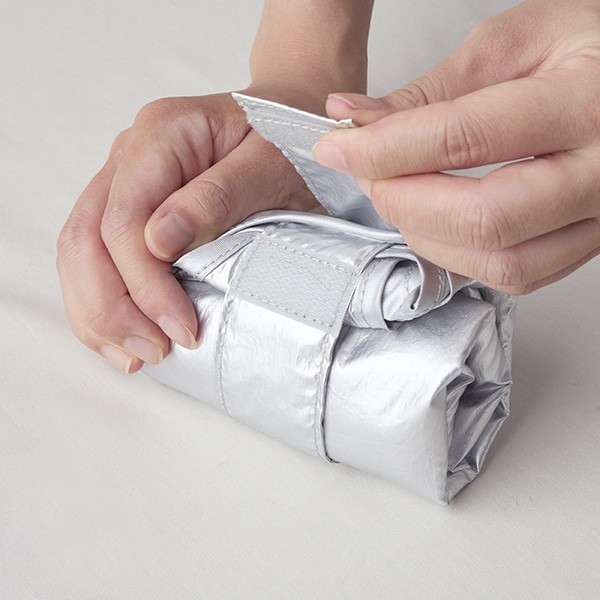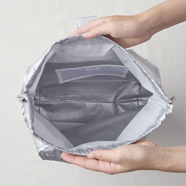 裏地は薄手のアルミシートなので、バッグを使用しない時は、付属のテープで丸めてコンパクトに収納できます。