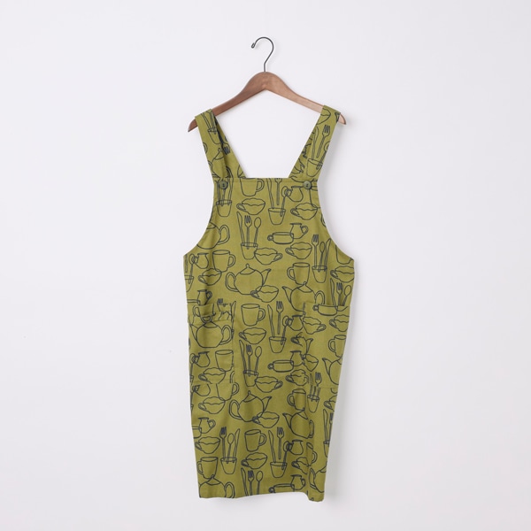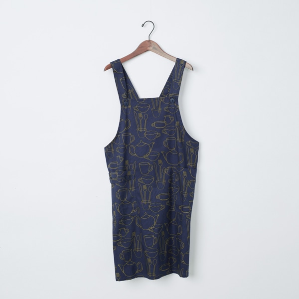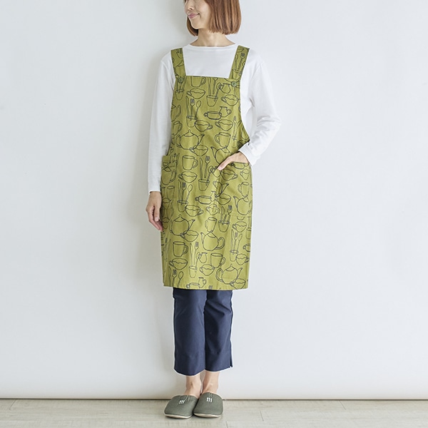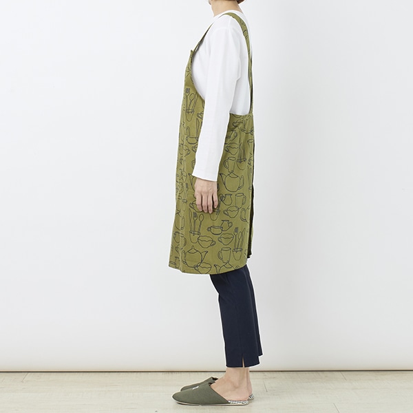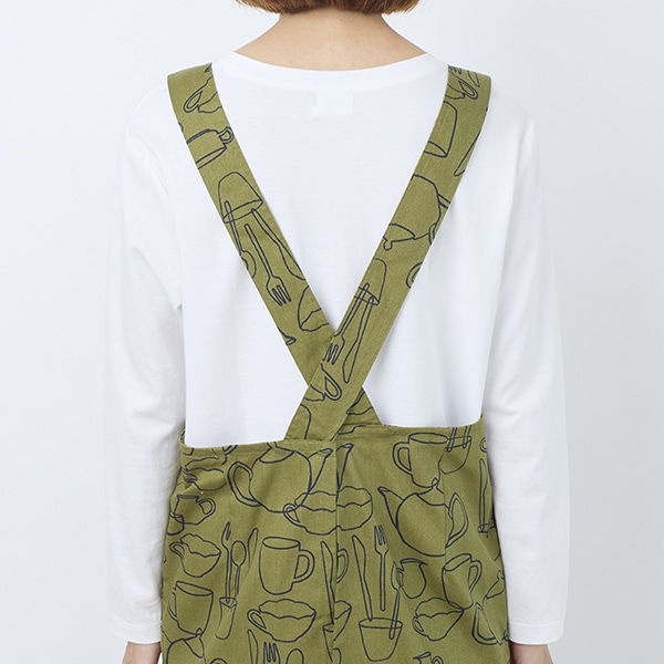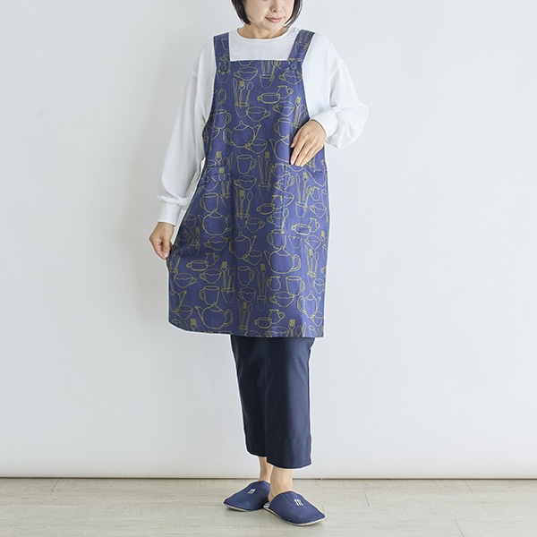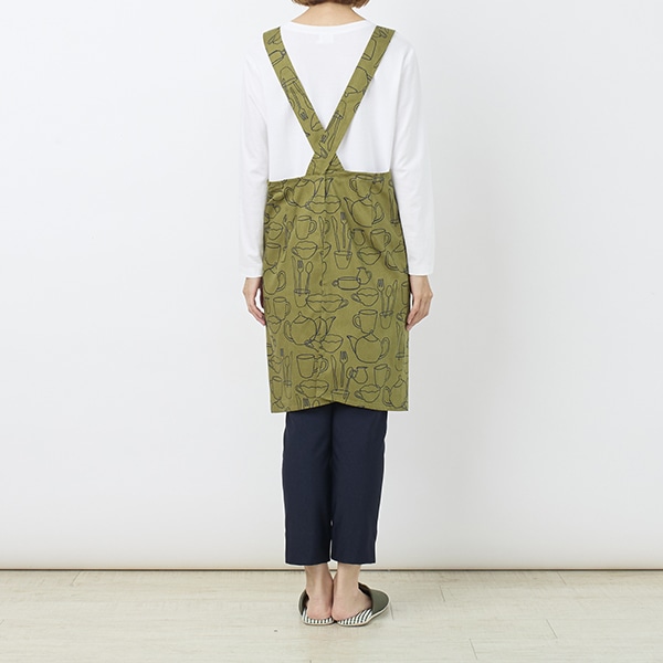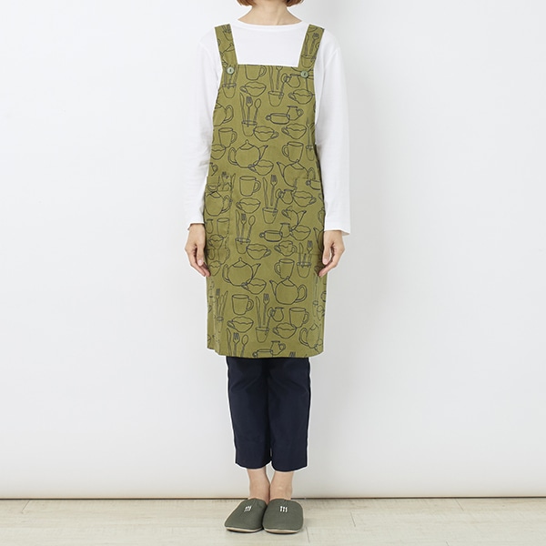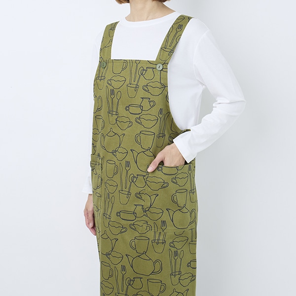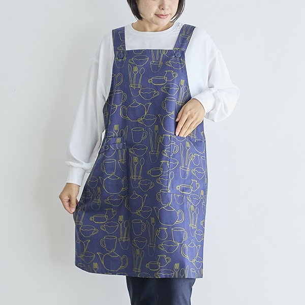 ティーポットやマグカップ、カトラリーのモチーフをプリントしたエプロン。