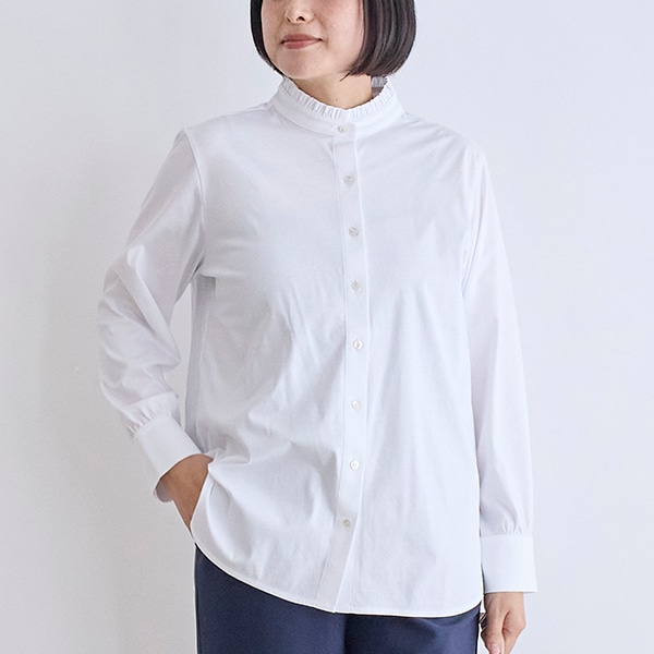 一枚ではもちろん、寒い時期にはセーターやカーディガンを合わせると、襟からのぞくフリルがアクセントになり、重ね着を楽しめます。