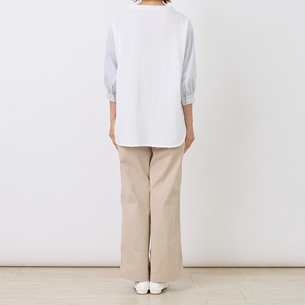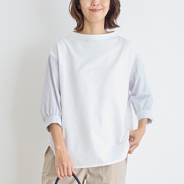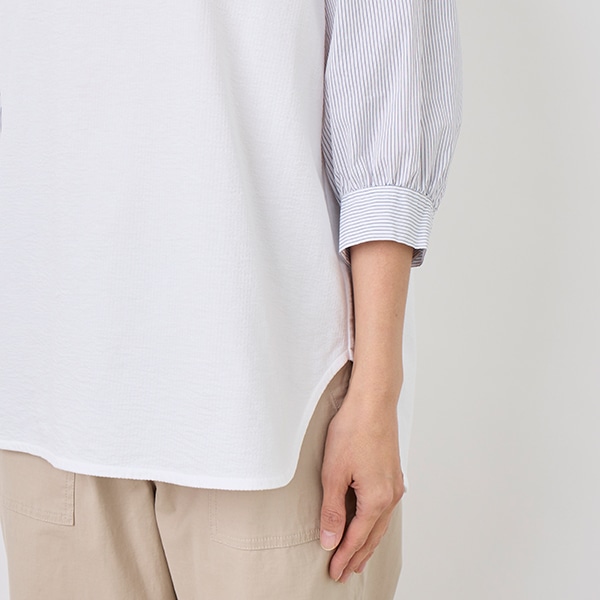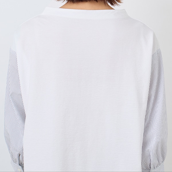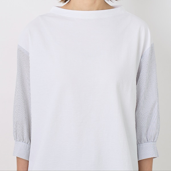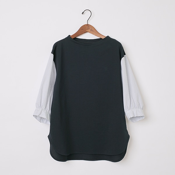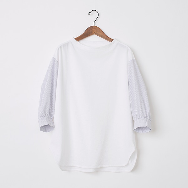 サッカージャージー素材の身頃部分に、コットン素材のストライプ柄の袖を合わせました。