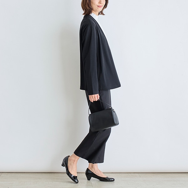 同素材のワンピースを合わせれば、冠婚葬祭や食事会などフォーマルなシーンにも◎