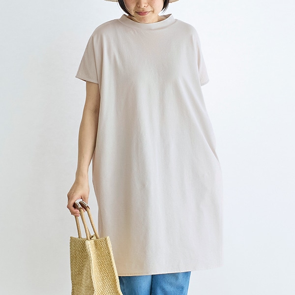 ゆとりのあるフレンチスリーブと長めの着丈が、気になる二の腕や腰まわりを自然にカバーしてくれる安心感のあるシルエットです。
