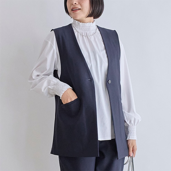 タートルネックやブラウスなどに合わせて羽織るだけで、コーディネートの幅が広がる万能なアイテムです。