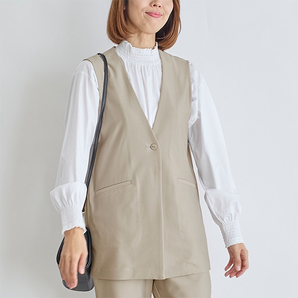 タートルネックやブラウスなどに合わせて羽織るだけで、コーディネートの幅が広がる万能なアイテムです。