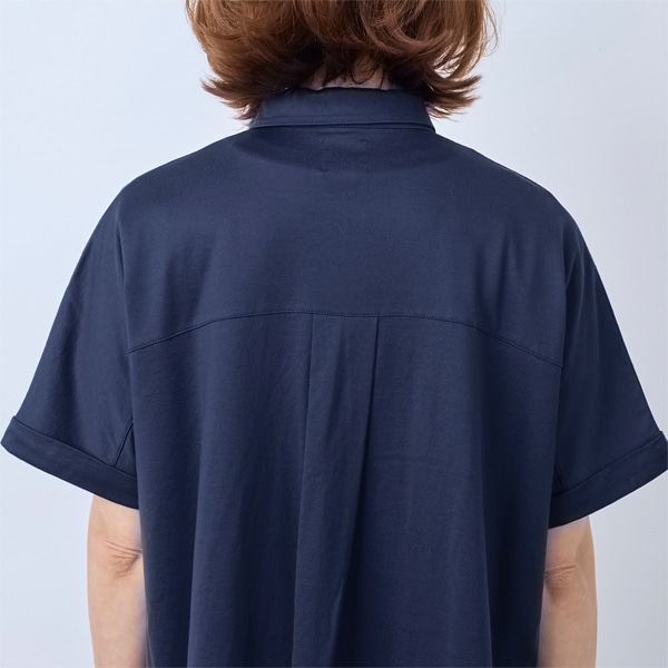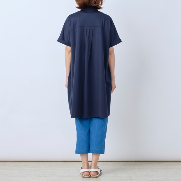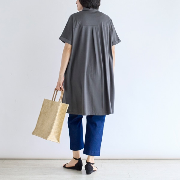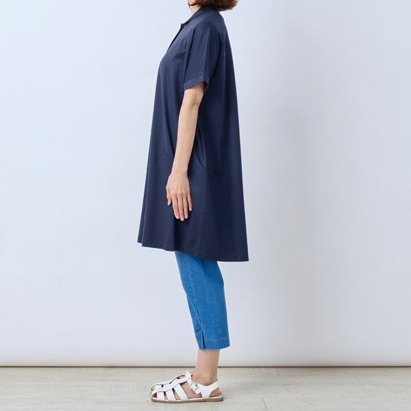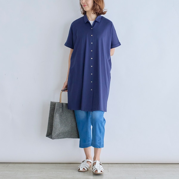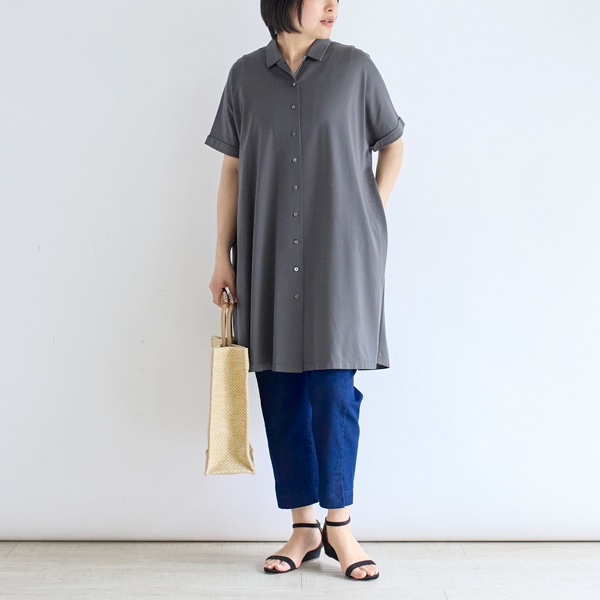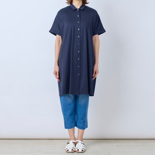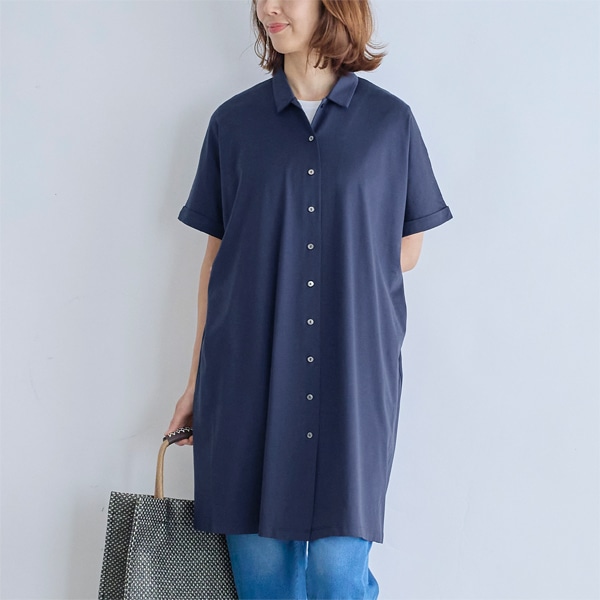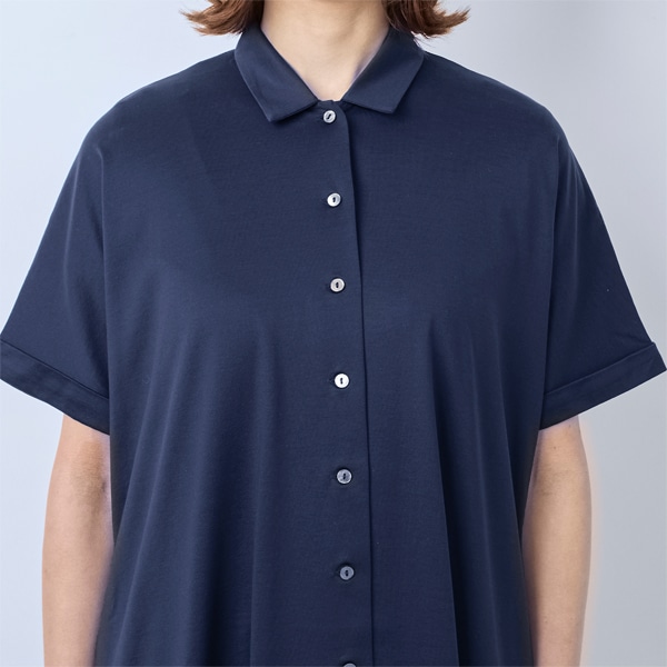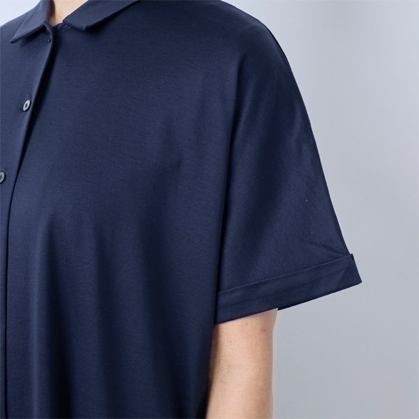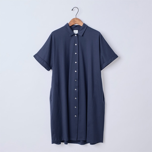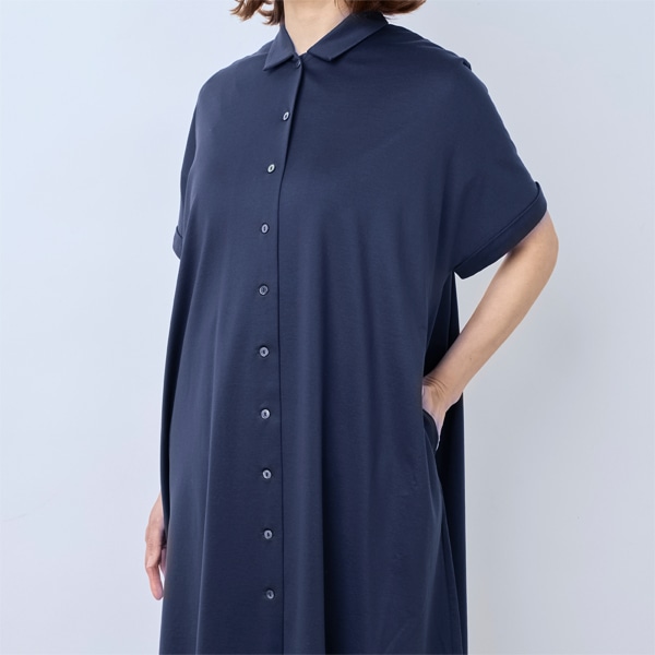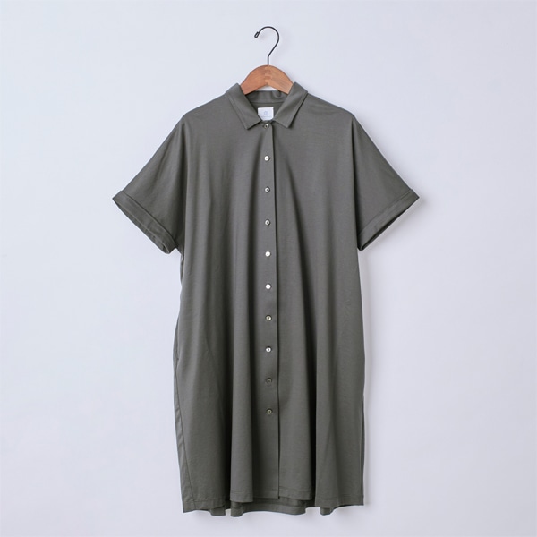 カットソー素材でありながら、シルクのような光沢がある上品なシャツワンピース。