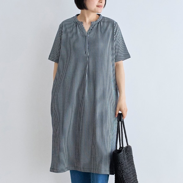 スキッパータイプのストライプワンピース。