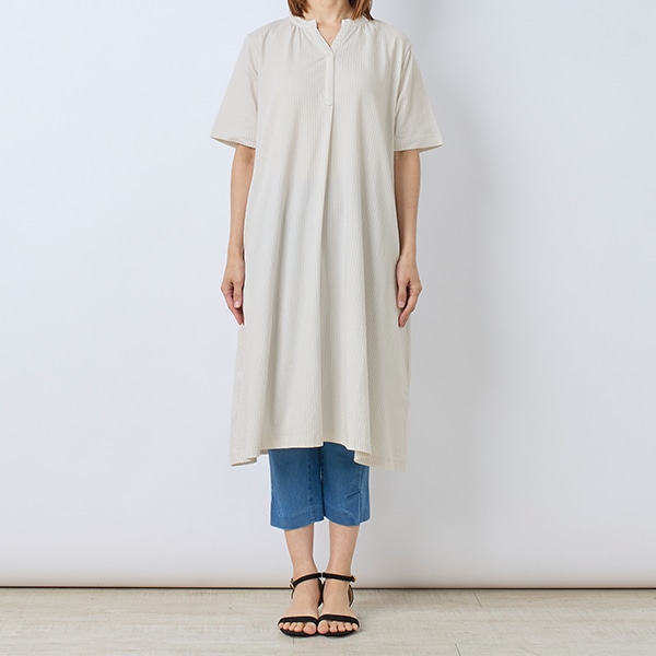 スキッパータイプのストライプワンピース。