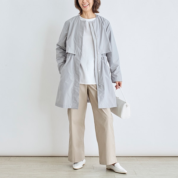 ストールを巻いてももたつかず、小物使いで表情豊かな着こなしが楽しめます。