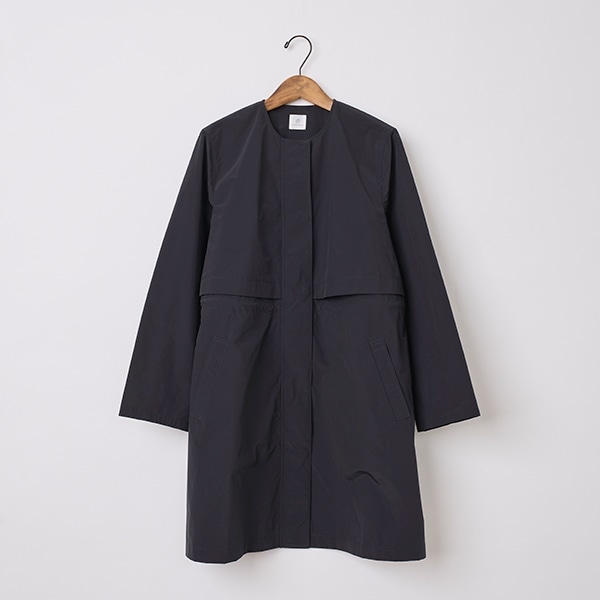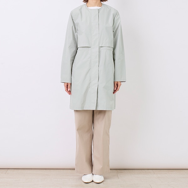 首元はパーカーやストールとも相性の良いノーカラーのデザイン。