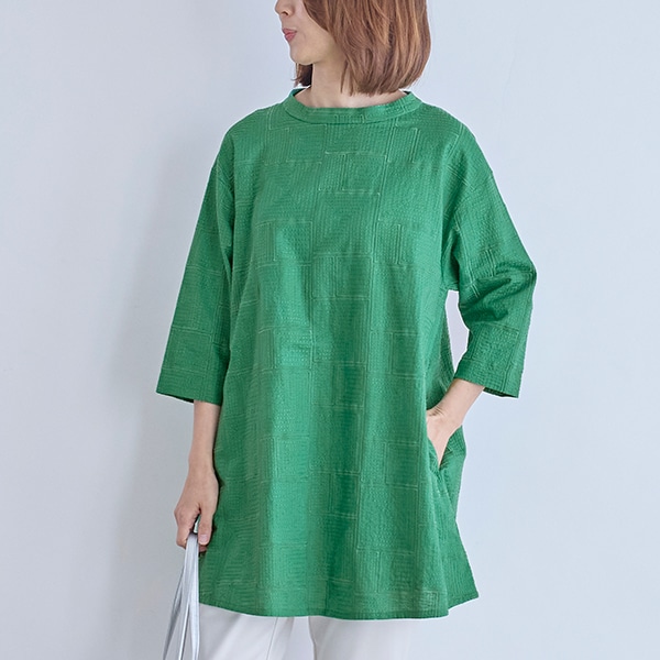 七分袖と腰まわりをカバーする安心の丈感で、ロングシーズン着回しできる一枚。