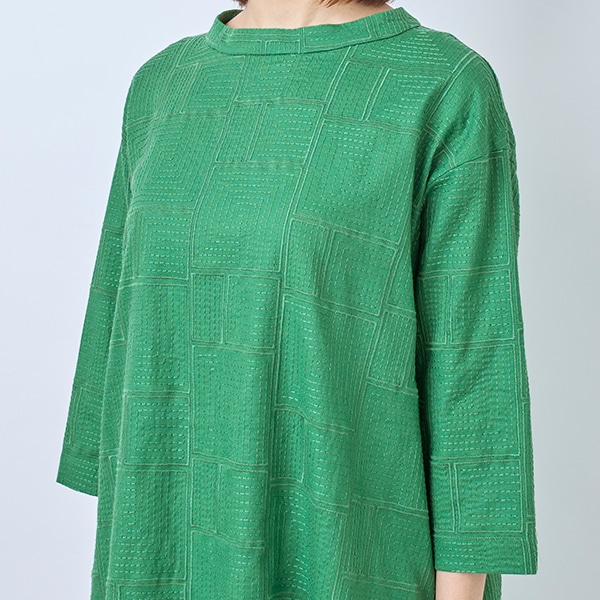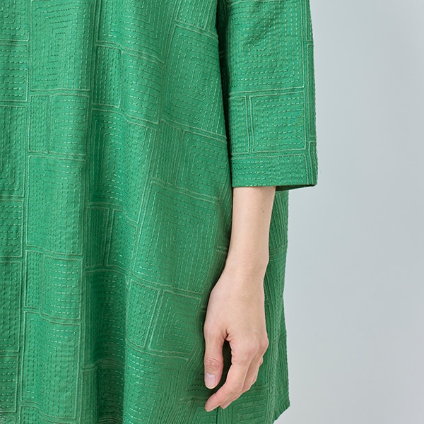 生地にあしらったスクエア柄の刺繍が印象的で、素材感を生かしたシンプルなデザインに仕上げました。
