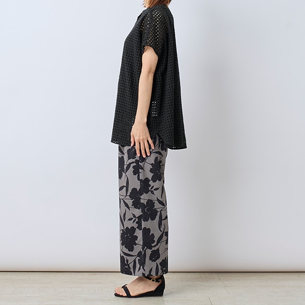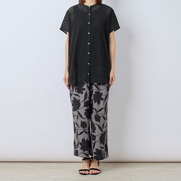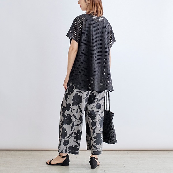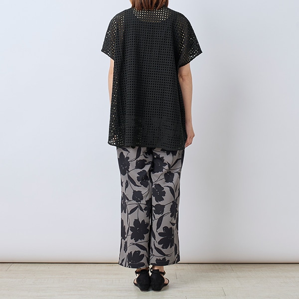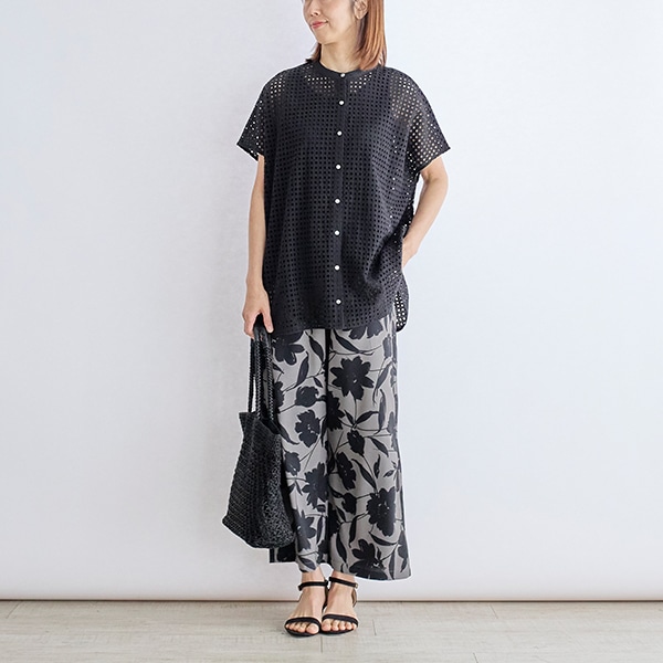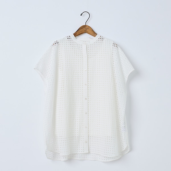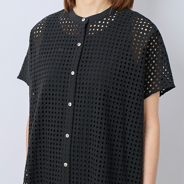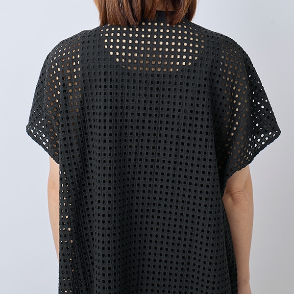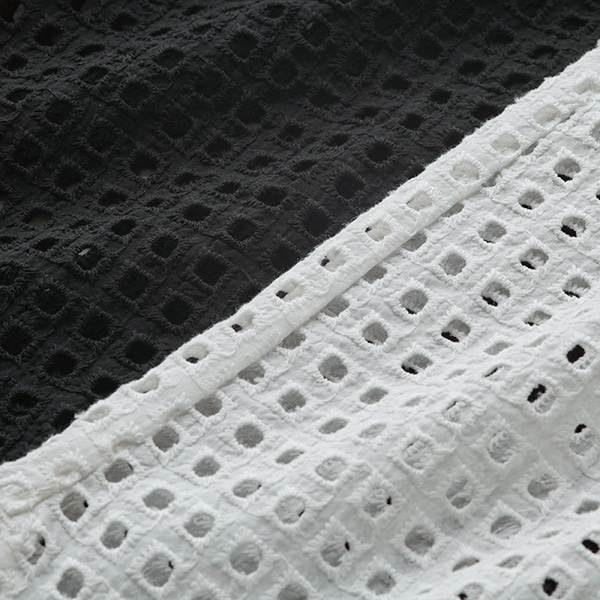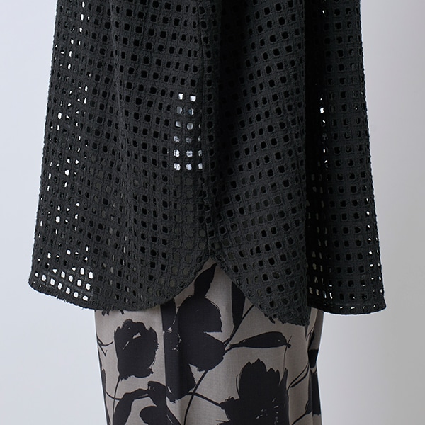 カットワーク刺繍を格子状にあしらった生地で、シアー素材とはひと味違う表情を楽しめる、トレンド感のあるデザイン。