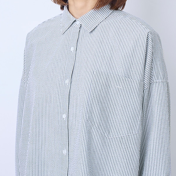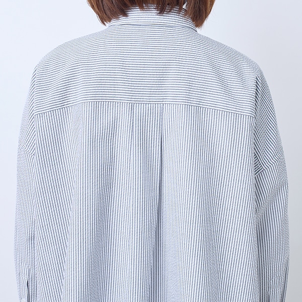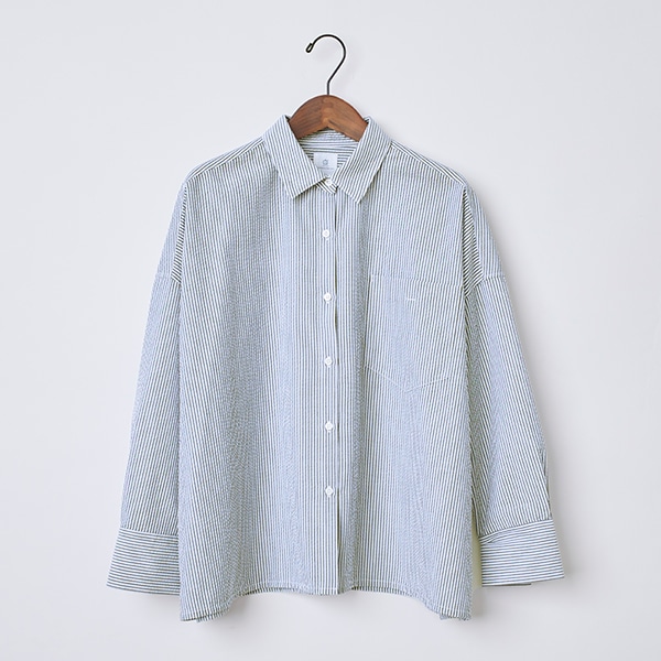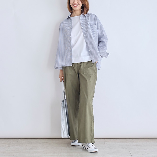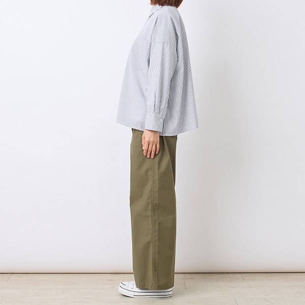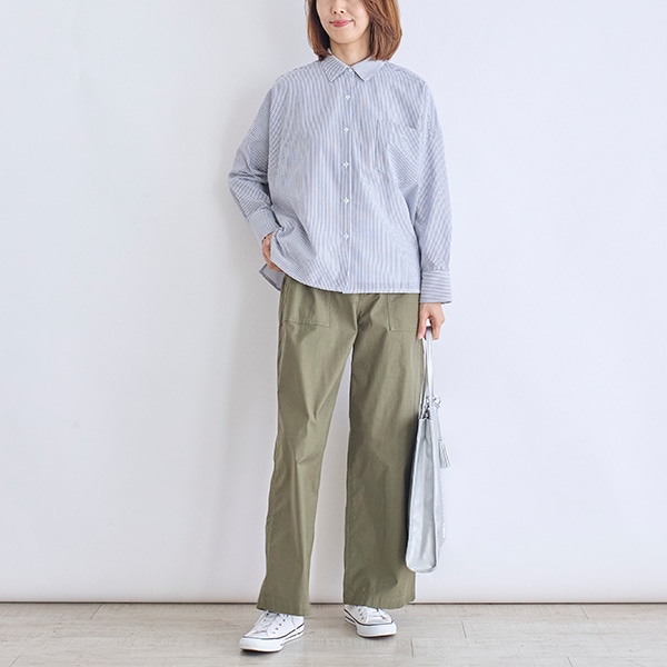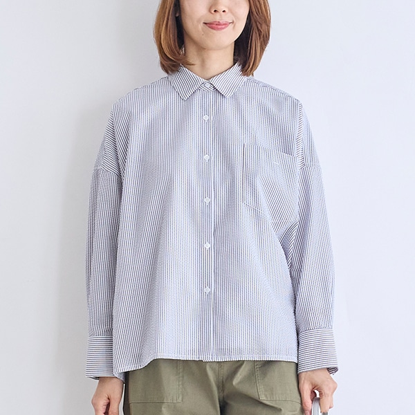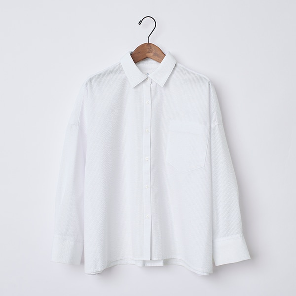 ワイドシルエットの襟付きシャツ。
