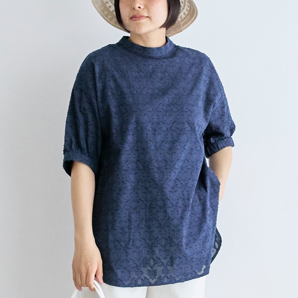 印象的な織り柄が魅力のハイネックブラウス。