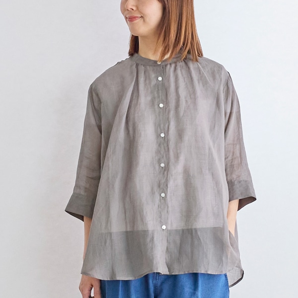 清潔感のあるバンドカラーデザインで、一枚ではもちろん、ボタンを開けて、ワンピースやTシャツの上に羽織るのもおすすめです。