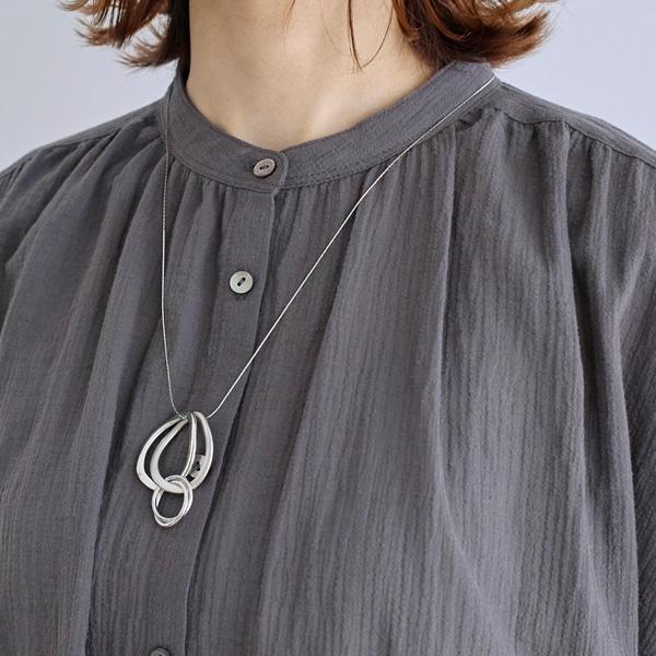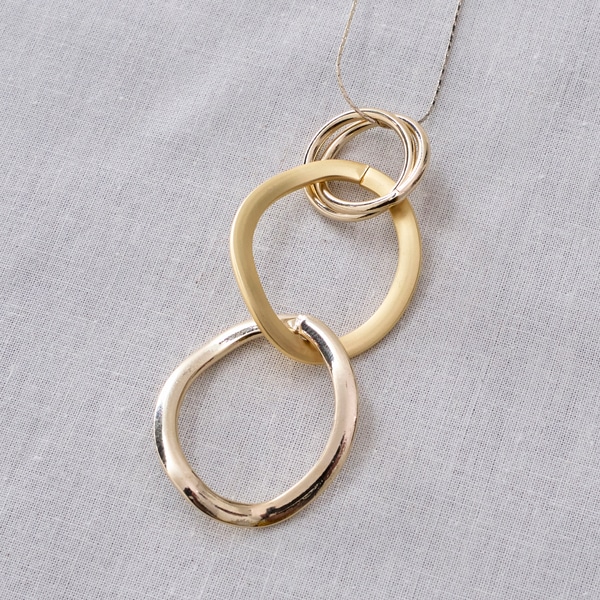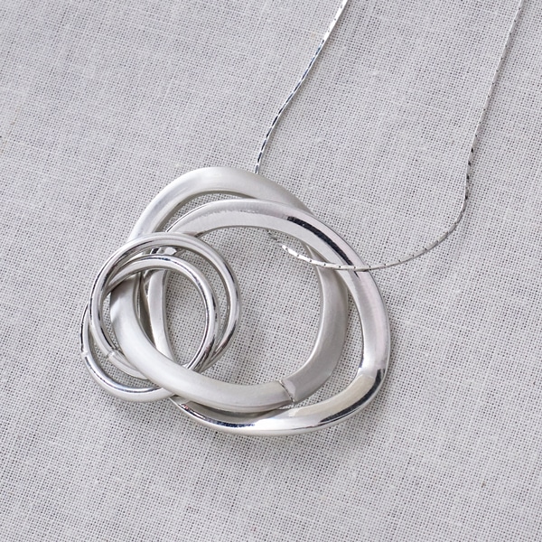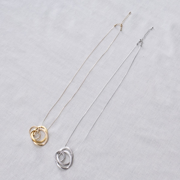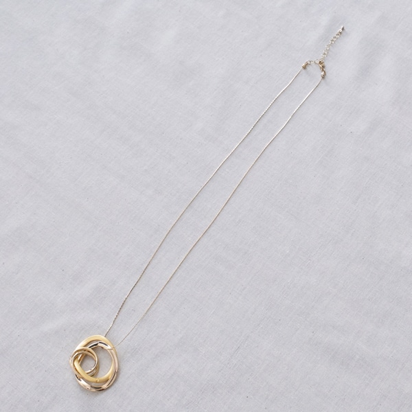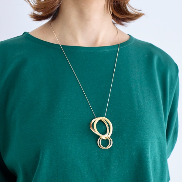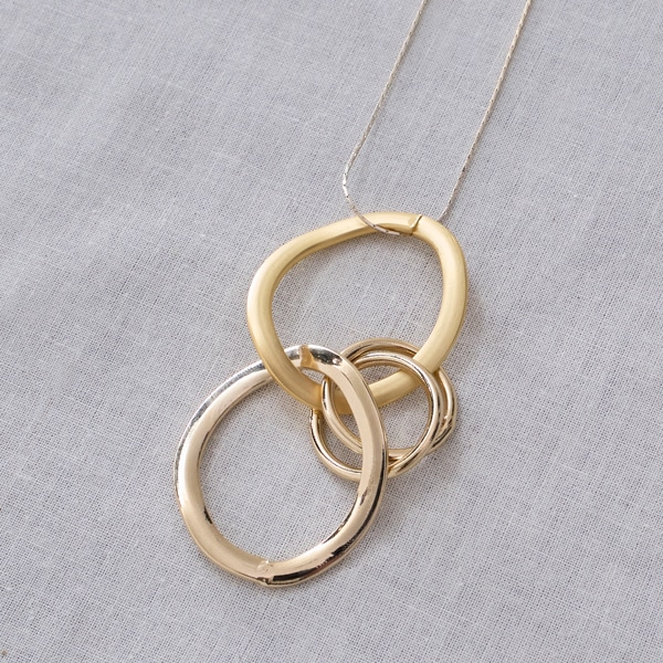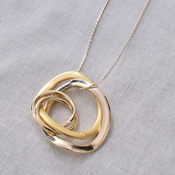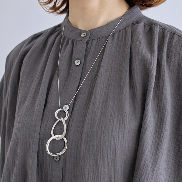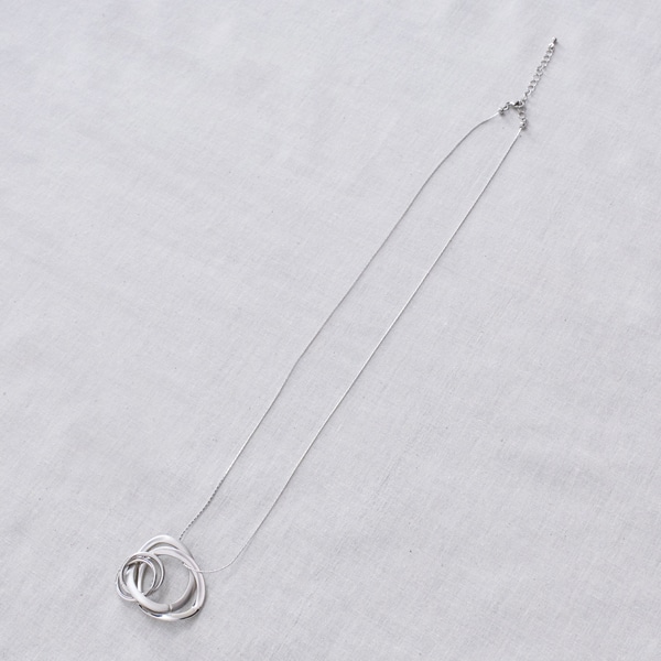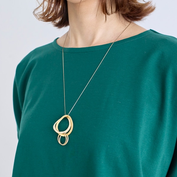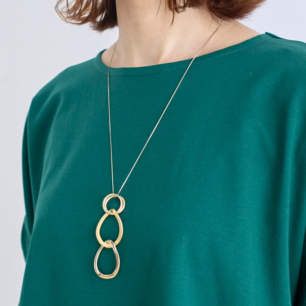 質感の異なる3連リングをトップに配した、表情豊かなロングネックレス。