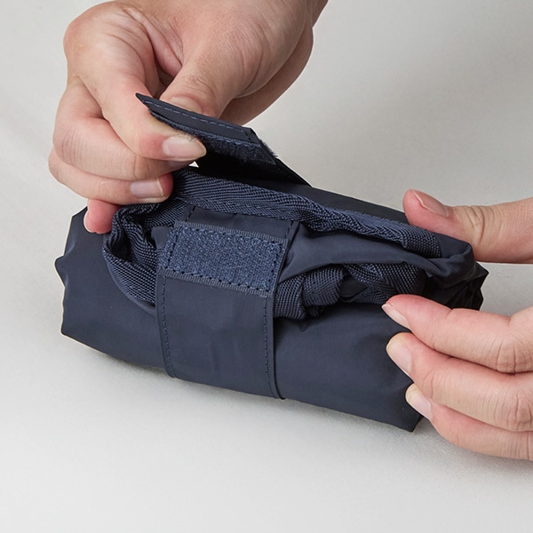 裏地は薄手のアルミシートを使用し、バッグを使用しない時は、付属のテープで丸めてコンパクトに収納できるのがうれしいポイント。