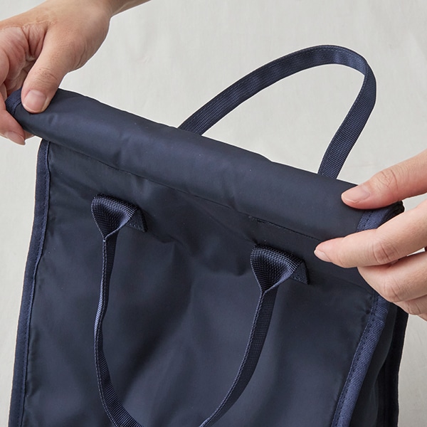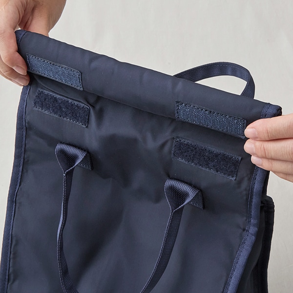 バッグの口をくるくると巻くだけで留められる、使いやすいベルクロ仕様です。