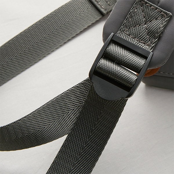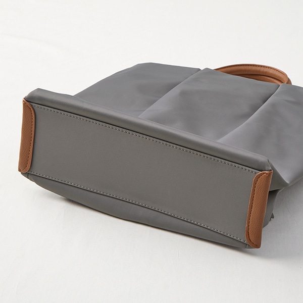 光沢のあるナイロンと、部分使いした柔らかい合皮のコンビで、
