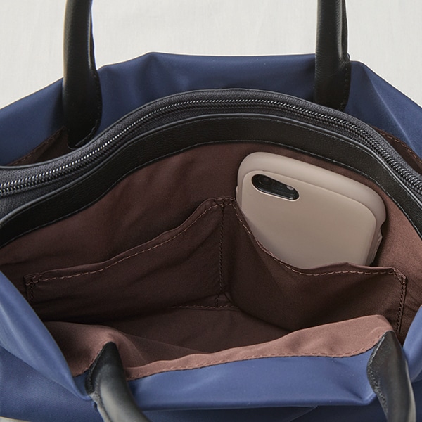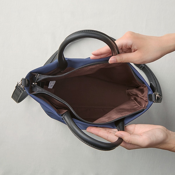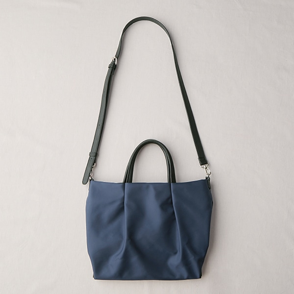 上品な光沢のあるナイロンに、手触りのよい柔らかい合皮を合わせました。