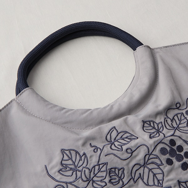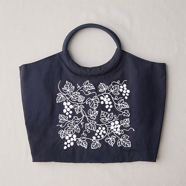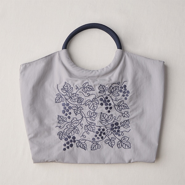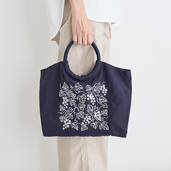 立体的なぶどう柄の刺繍が目を引くマルシェバッグ。