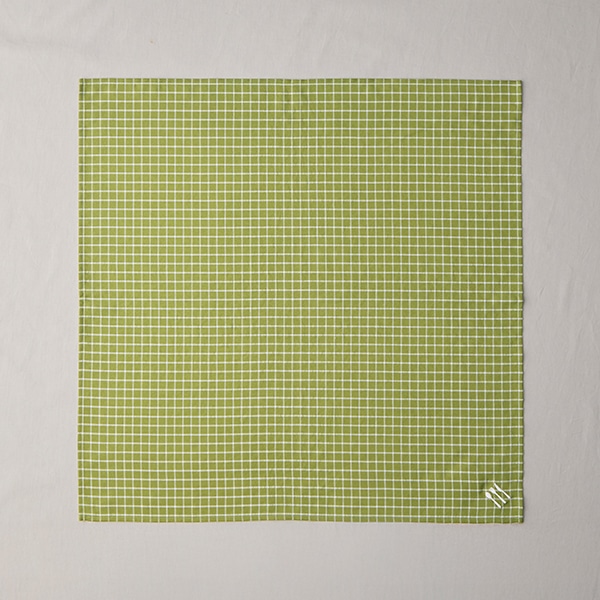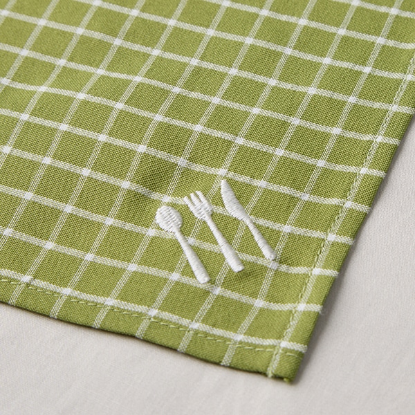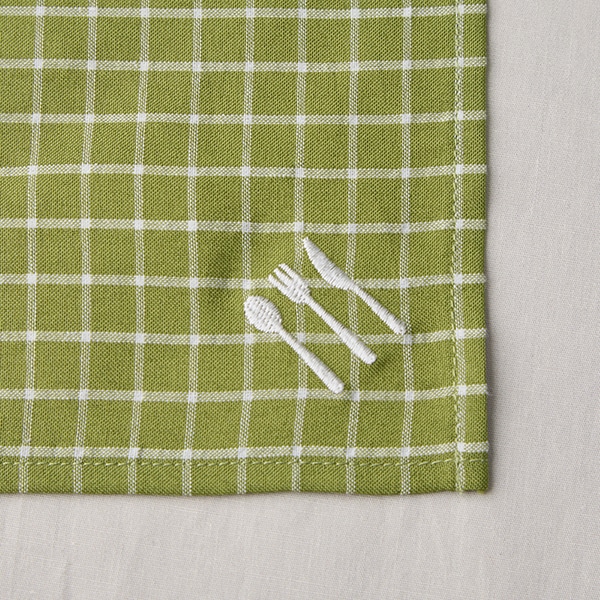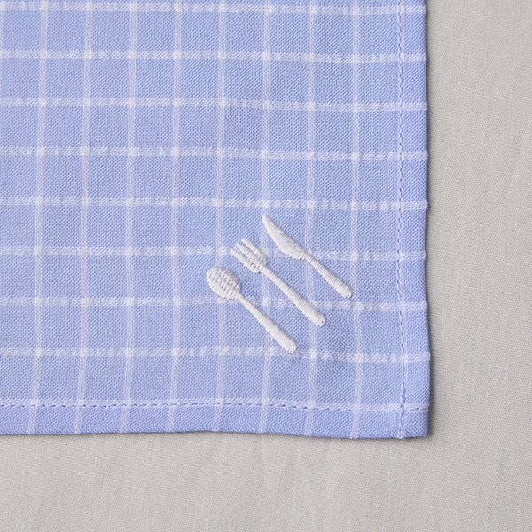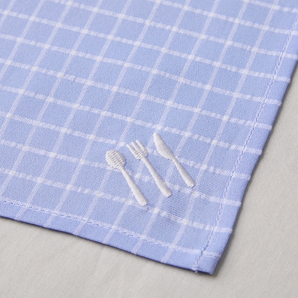 格子状のチェックの生地に、さりげないカトラリー刺繍がポイント。