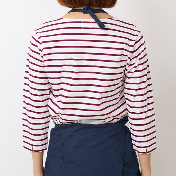 首紐を好みの長さに結んで長さ調節ができる、首掛けのデザインです。