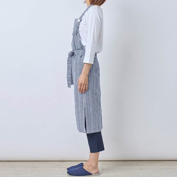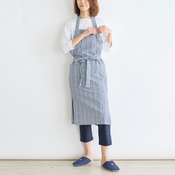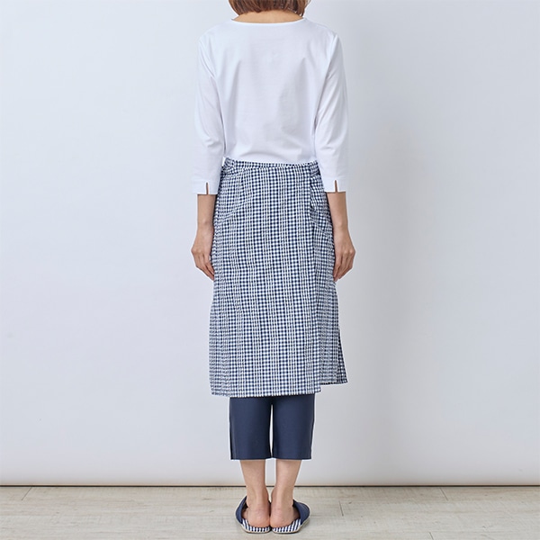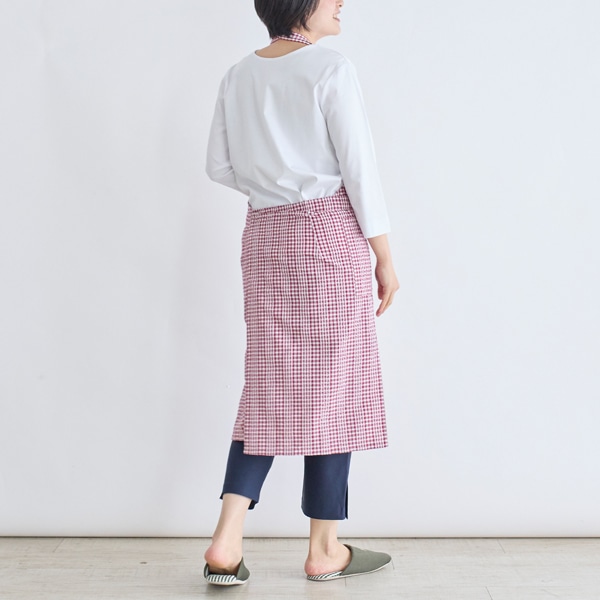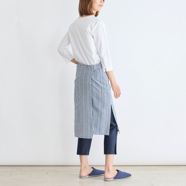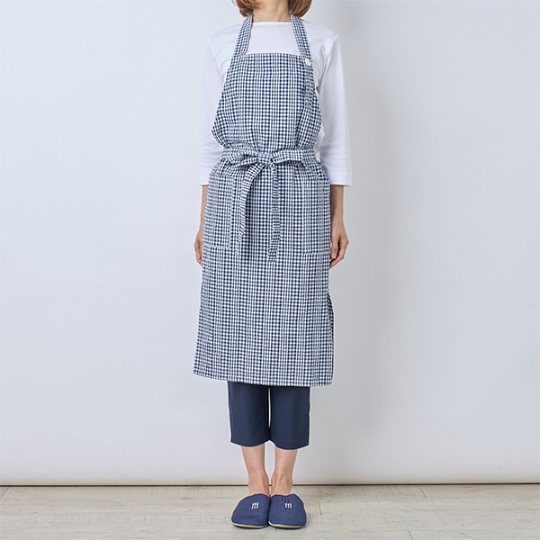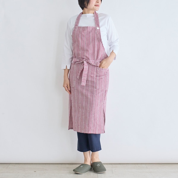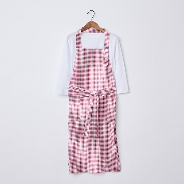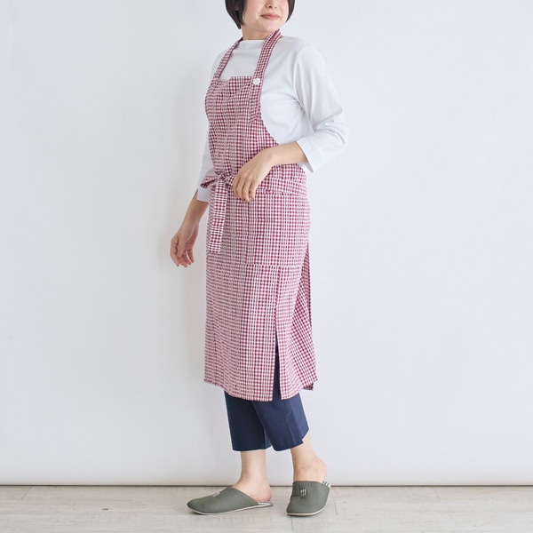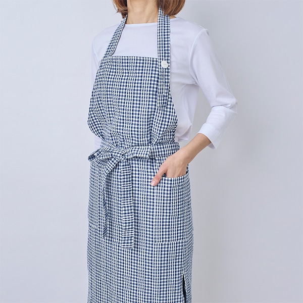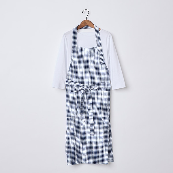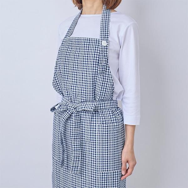 肌離れの良いサッカー素材のチェック柄エプロン。