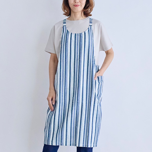 清潔感のあるストライプ柄のY字型エプロン。