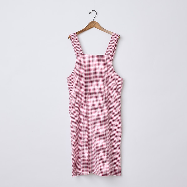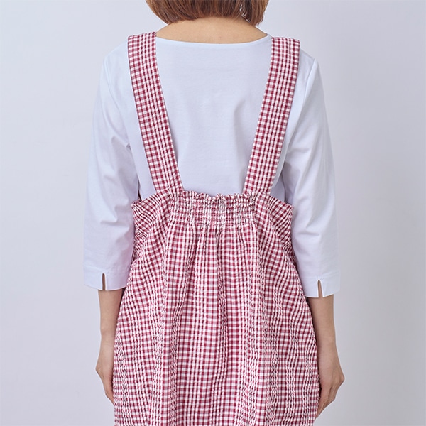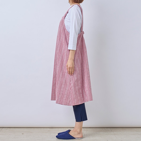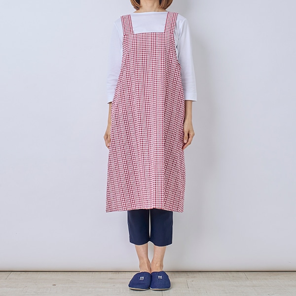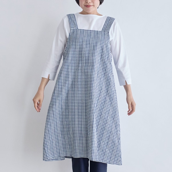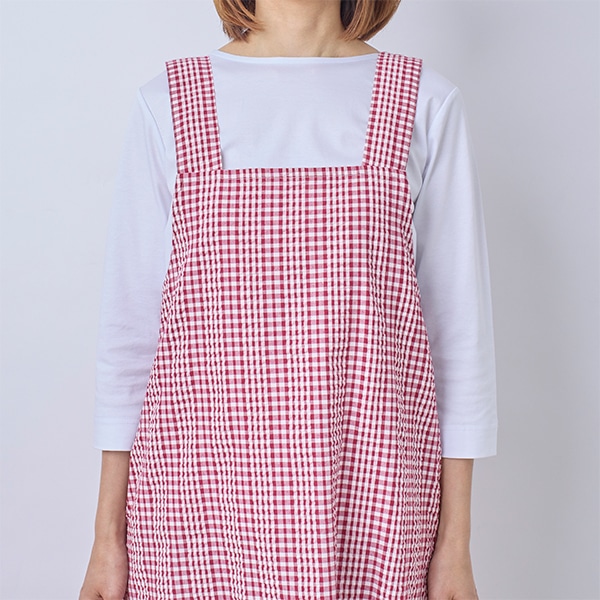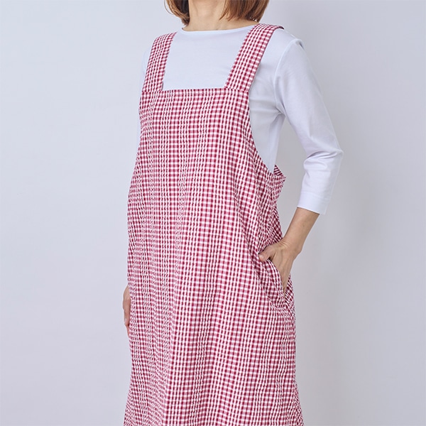 肌離れの良いサッカー素材のチェック柄エプロン。