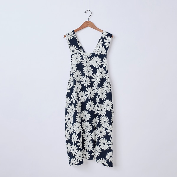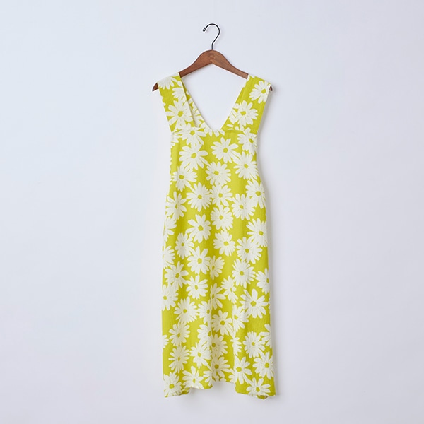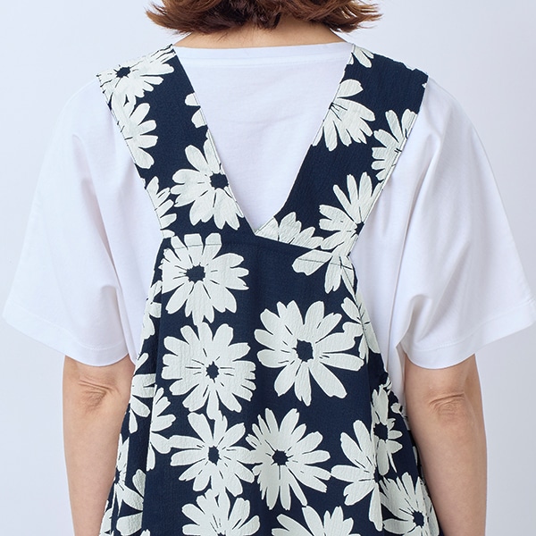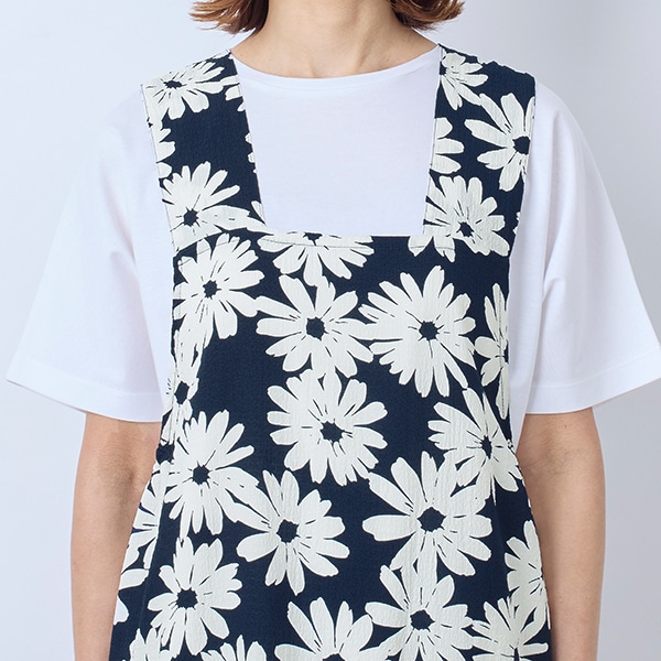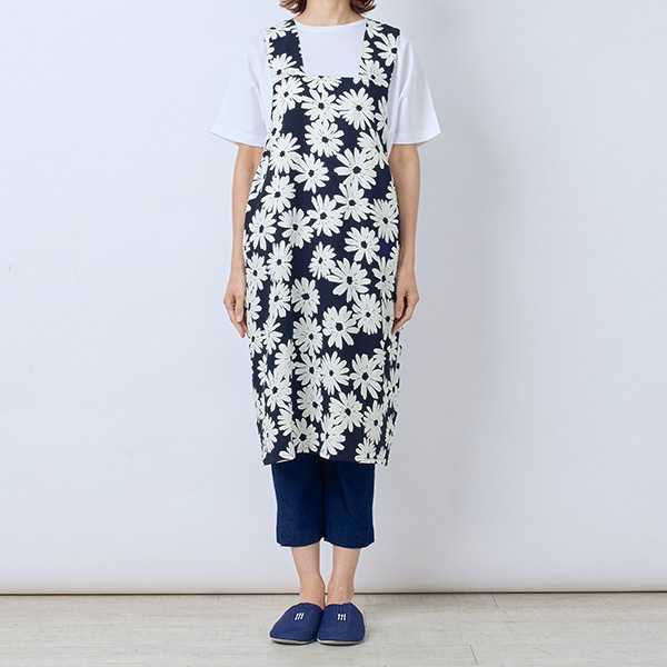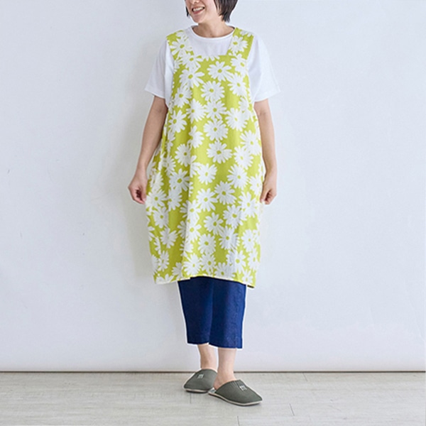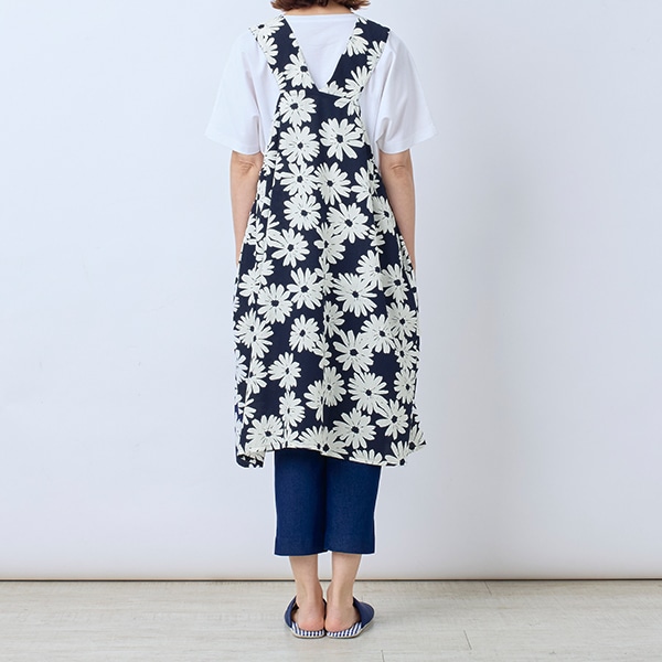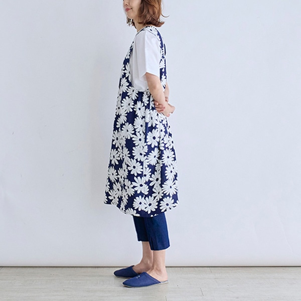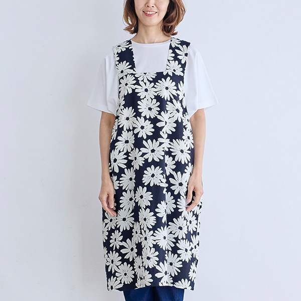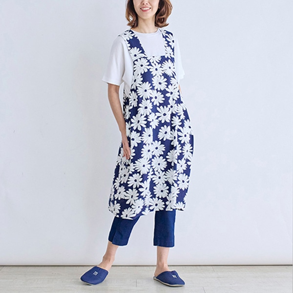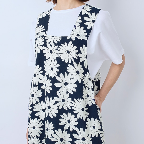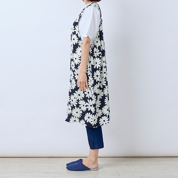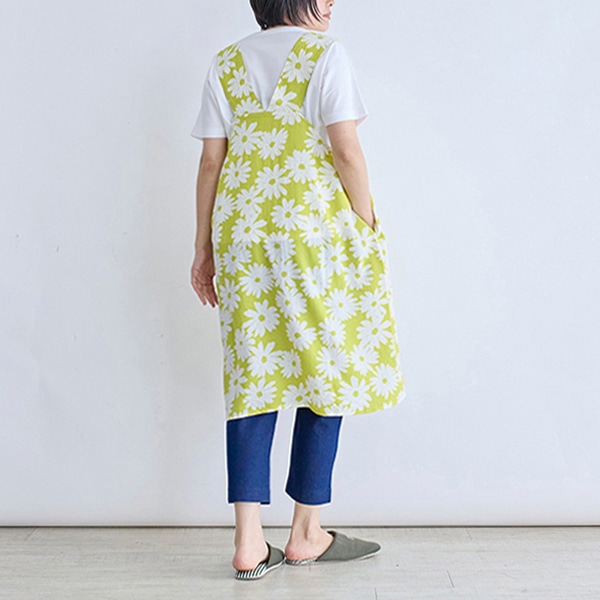 大きなガーベラ柄が目を引く、ジャンパースカートタイプのエプロン。