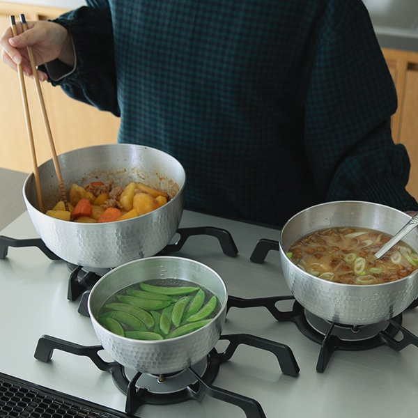 シンプルな形なので、限られたスペースでも同時に複数の鍋を扱える使い勝手の良さが魅力です。