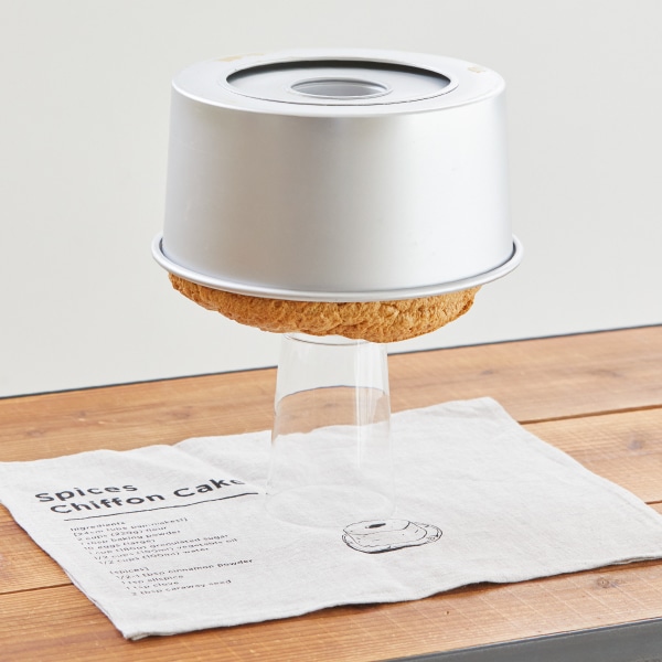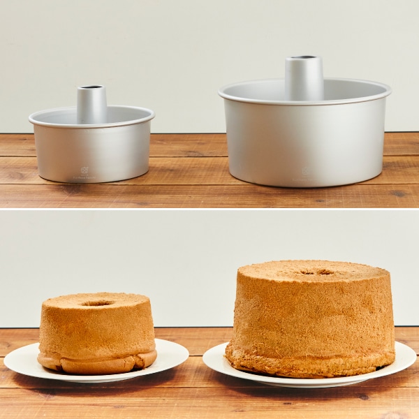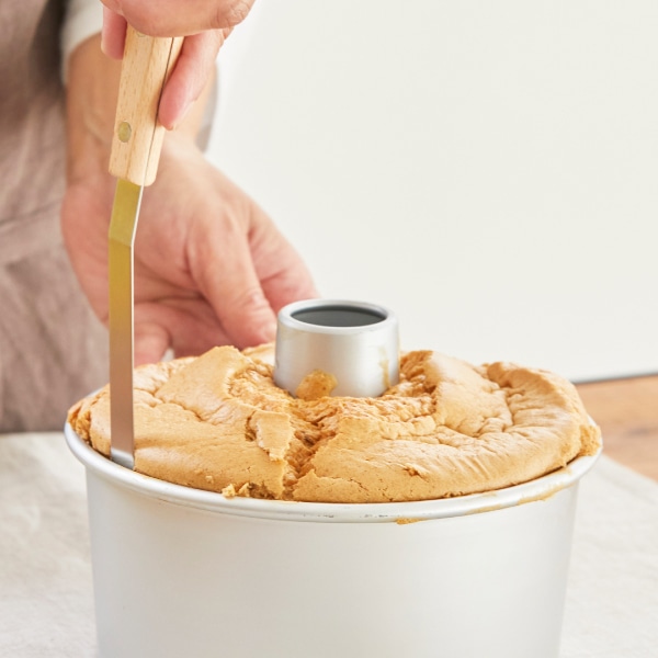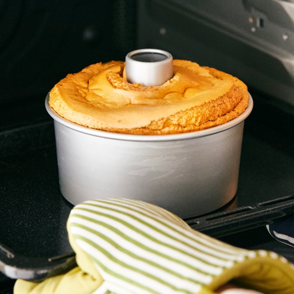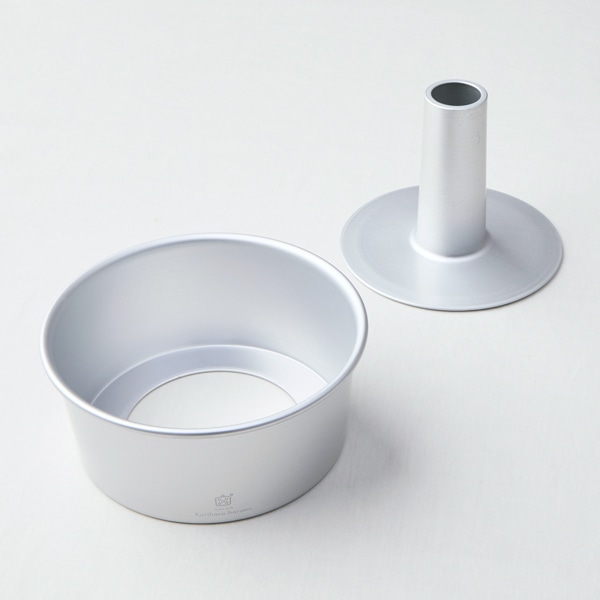 傷がつきにくいアルマイト加工を施した、アルミ製のシフォンケーキ型。