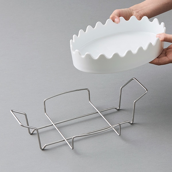 アツアツの焼き立てを味わってほしくて、すぐ食卓に運べるようステンレスホルダーをつけました。