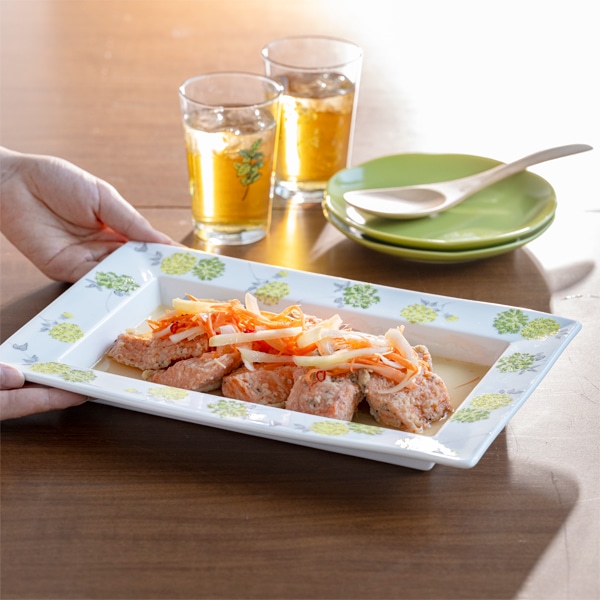 イエローとグリーンの花柄をあしらったリムトレーは、食卓の主役になる一枚。