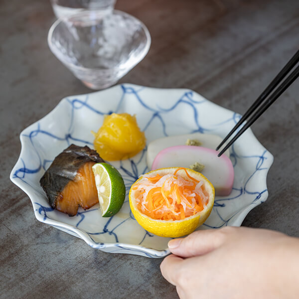 縁起のいい伝統的なあみ目柄は、お正月料理を少しずつ盛ったり、お刺身などにもよく合います。