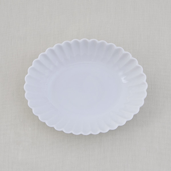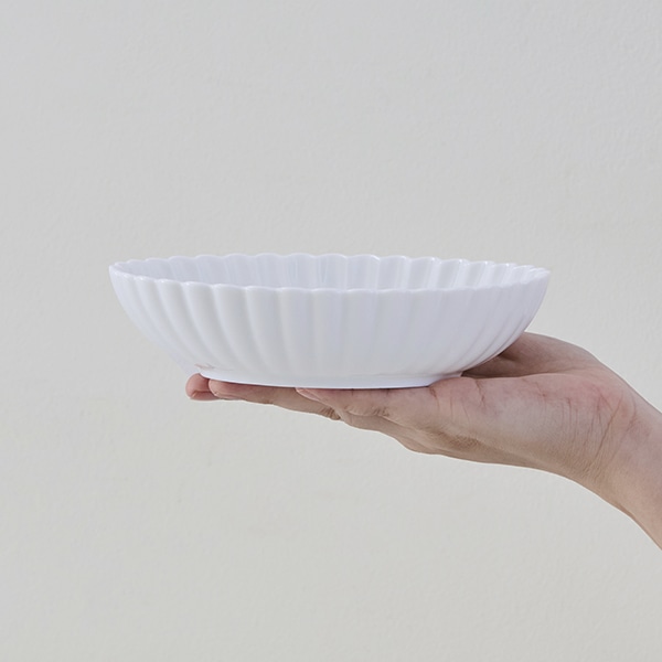 オーバル型と輪花のふちが、和洋中、どんな料理にも合わせやすいデザインです。