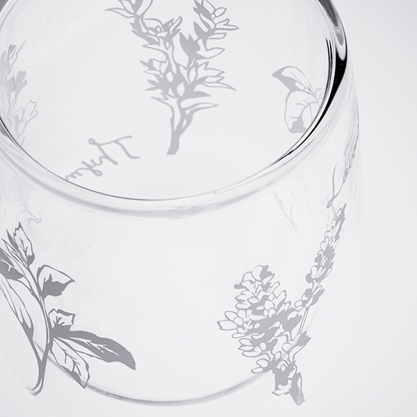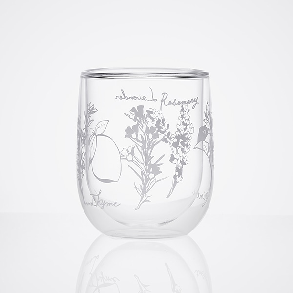 手になじむ丸いフォルムのグラスには、栗原はるみの自宅の庭で育つタイム、ローズマリー、ミント、ラベンダー、レモンの5種類のハーブをモチーフにしたイラストをあしらいました。