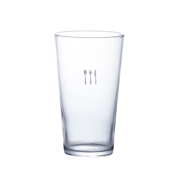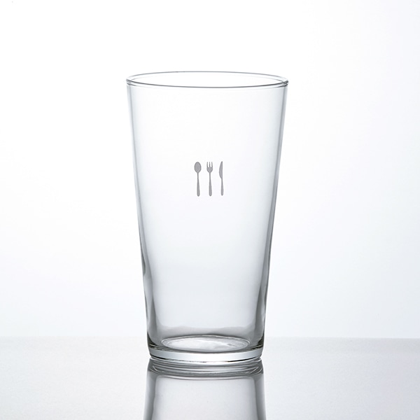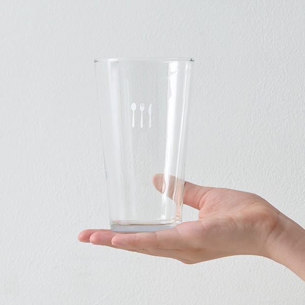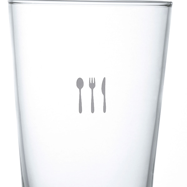 ワンポイントのカトラリー柄をあしらったガラスのタンブラー。