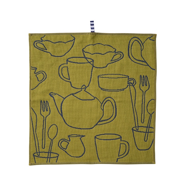 ポットやカップなど、ティータイムを楽しむときに使う食器をあしらったふきんです。