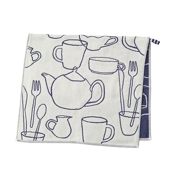 ポットやカップなど、ティータイムを楽しむときに使う食器をあしらったふきんです。