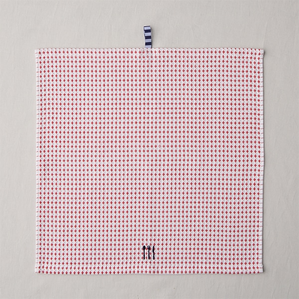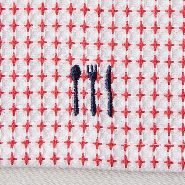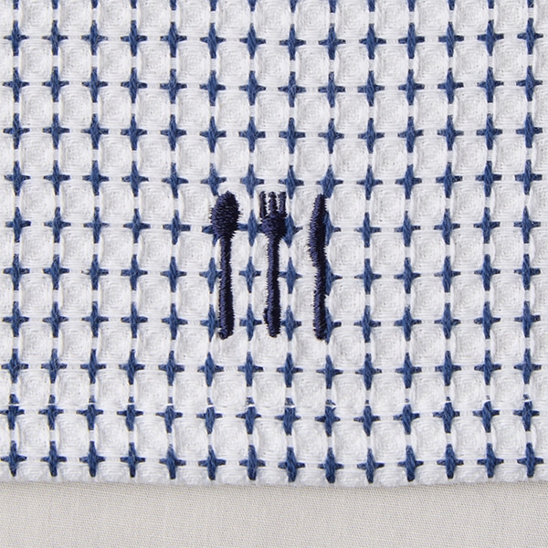 ネイビーカラーの糸で縫った、カトラリーマークの刺しゅうがポイント。