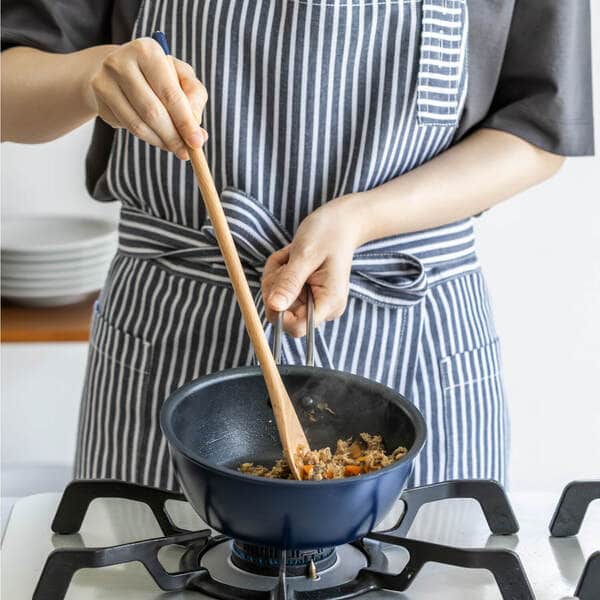先がコンパクトで小回りが利くから、細かい食材を炒めたり、混ぜたりするのはお手のもの。小さいフライパンや鍋との相性も抜群です。また、ひき肉のように食材をほぐしながら混ぜたいときにもおすすめです。木製ならではのあたりの柔らかさと、先の丸さで、調理器具を傷つけにくいのもうれしいポイントです。
